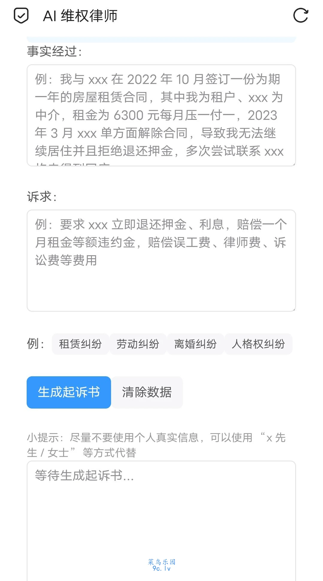 AI 维权律师,一个基于ChatGPT搭建的AI律师维权小助手,帮助用户一键生成起诉书,帮助用户维护自身权yi,而且是个免费的AI律师助手服务,打开就能使用,无需注册登录,使用的时候需要注意的是,涉及个人隐私真实信息,可以使用 “x 先生 / 女士” 等方式代替。