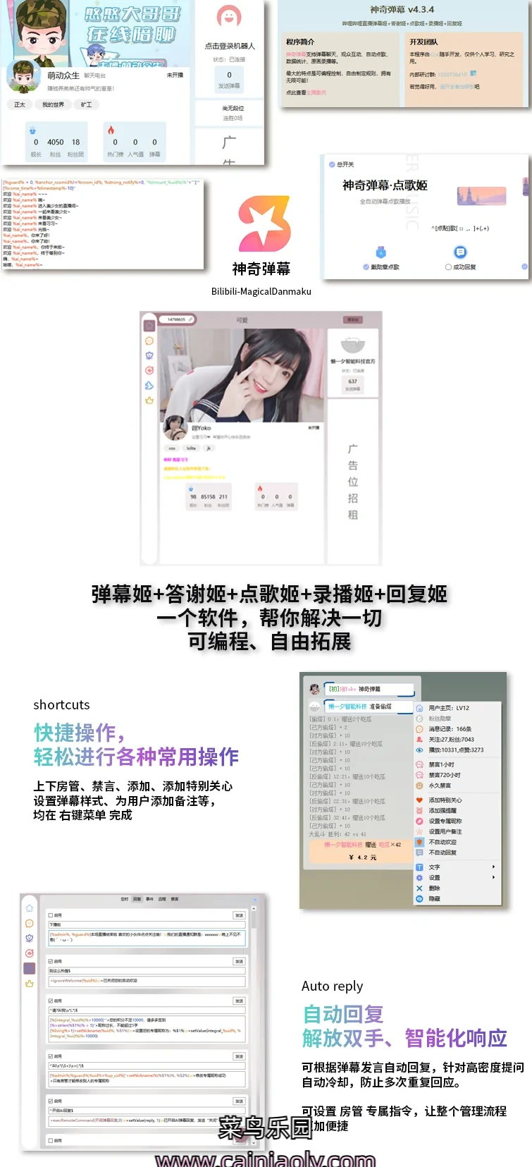 整合弹幕姬+答谢姬+点歌姬+回复姬+多种大模型AI+工作流(workflow),支持弹幕聊天、观众互动与管理、数据统计与分析、自动点歌、私信处理、AI自动闲聊、AI直播建议等。最大的特点是可编程控制,像搭积木一样设置各种互动规则,打造专属直播风格!