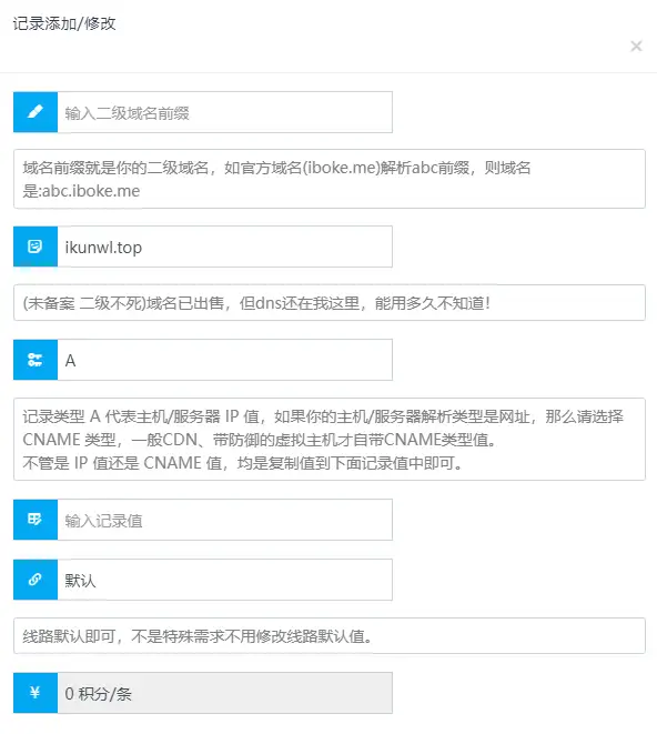 注册二级域名平台,添加解析,找到ikunwl.top域名,解析使用,理论二级不死,如果死了,就在解析一个!